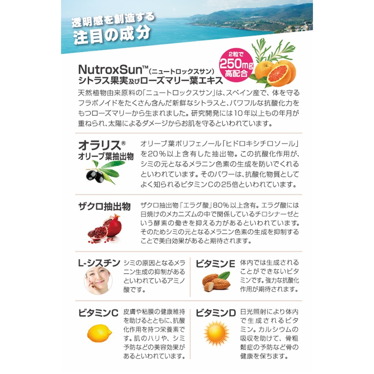 シトラス果実及びローズマリー葉エキス末、でんぷん、ザクロ抽出物、オリーブ葉抽出物、ビタミンE含有植物油、HPMC、ビタミンC、ステアリン酸カルシウム、L-シスチン、リン酸三カルシウム、微粒二酸化ケイ素、クチナシ黄色素、ビタミンD